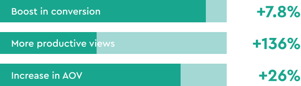 - Due to enhanced navigation customers spend significantly more time on the site and as consequence, see 136% more product detail pages during their visit.