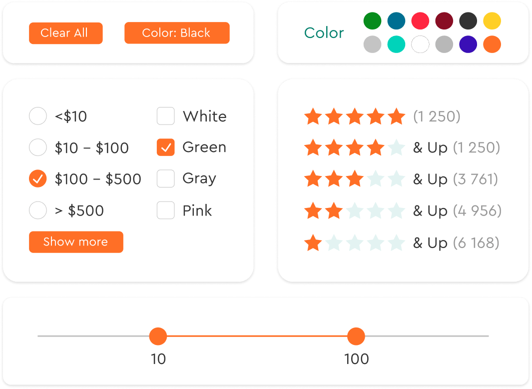 Setup smart filtering based on any product attributes, to narrow down the products in your category according to customer preferences.