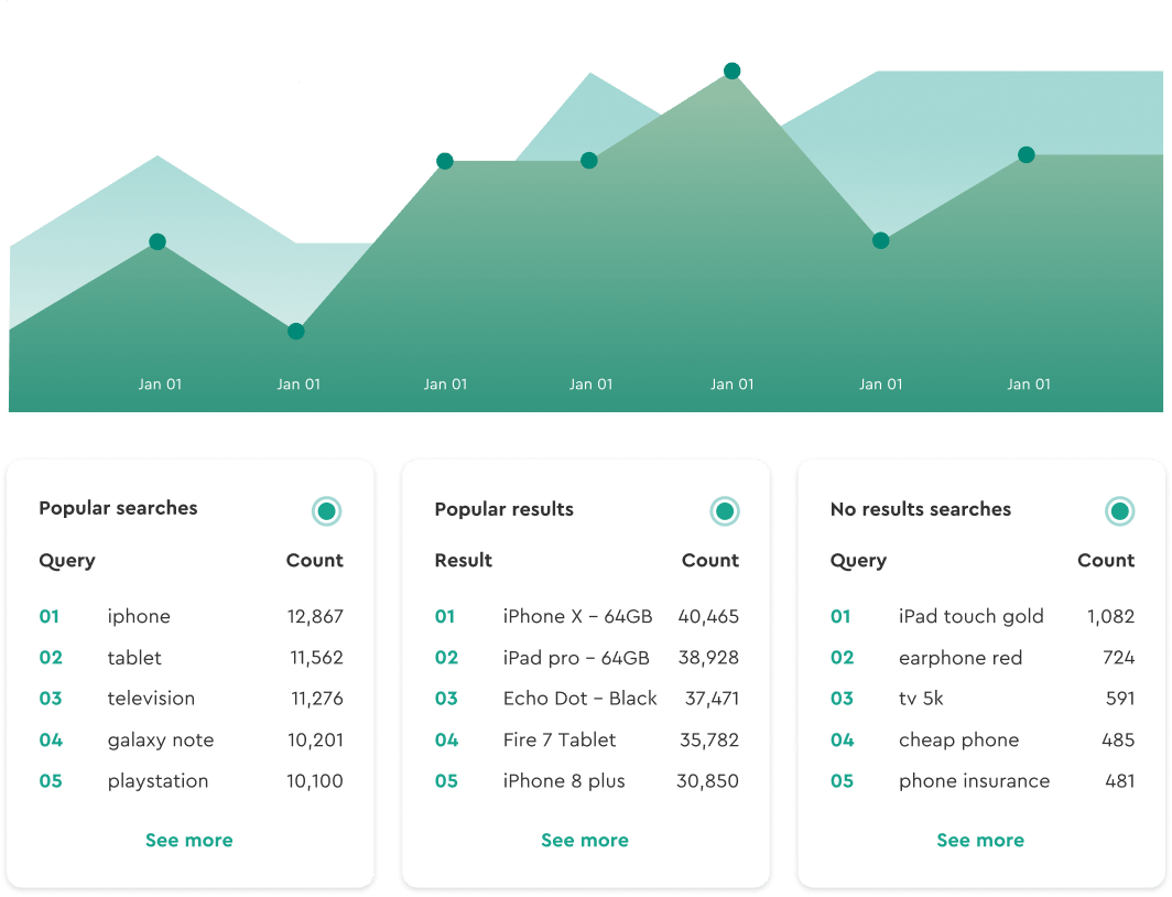 Powerful analytics tools that will show you which search terms are most popular and what products are most searched across your catalog.